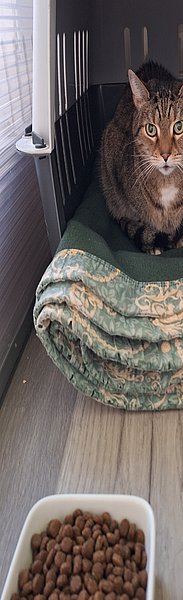 Momentan hat er Mozzi als Mitbewohnerin, deren lässige Art ihm gut tut. Er zeigte deutliches Interesse an anderen Katzen, die er zuvor von seinem Abteil aus sehen/hören konnte.