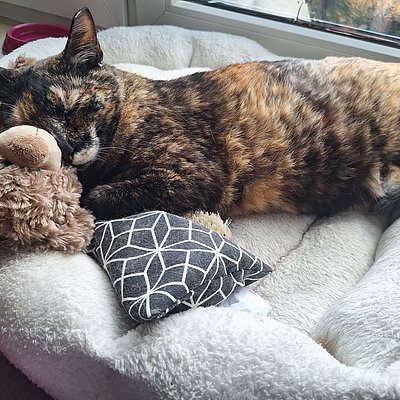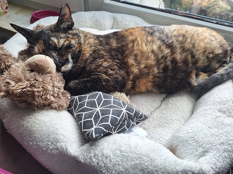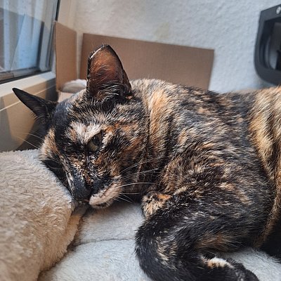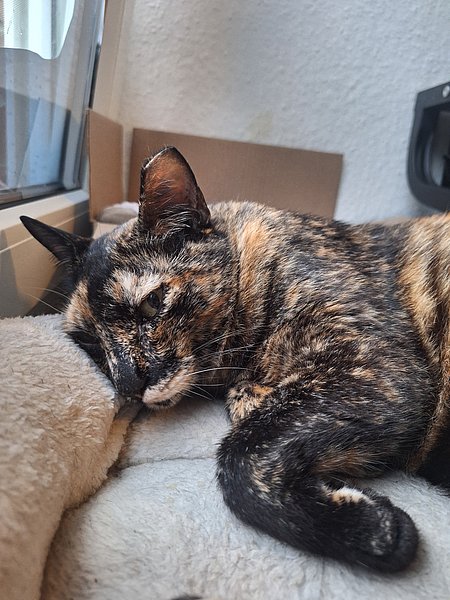 Sie sucht nähe, ist sehr verschmust. Sie liegt gern im Bett oder ganz oben auf einem Kratzbaum. Sie benutzt erfolgreich ein halbgeschlossenes Katzenklo mit Klumpstreu. Sie frisst gern trocken wie auch nass, unkompliziert, dabei aber nicht maßlos.